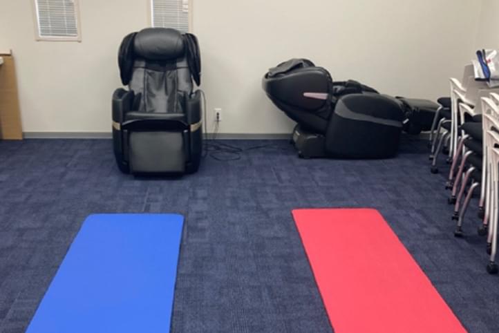 リラクゼーション室にストレッチマシンやマッサージ器(チェア)を導入し、社員が就業前後や休憩時間に自由にコンディショニングや疲労回復ができる環境を整備しています。混雑緩和のための簡易予約ルールと使用時間の目安を設け、利用後の消毒など衛生管理も徹底。安全面では体調不良時・持病がある場合の使用注意を喚起し、過度な利用を避けるよう声掛けをしています。今後は利用のモニタリングと満足度アンケートにより改善点を把握し、危機の更新や環境整備(照明・BGM等)を進めて、業務集中度と健康維持の双方に資する場として継続強化いたします。