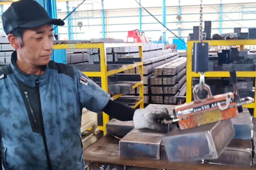 当社は、重量がある鋼材を取り扱う卸売・加工・物流現場の特性を踏まえ、体力差に左右されない職場づくりを一層推進しています。力の弱い高齢者や女性でも安全に鋼材を移動できるよう、リフティングマグネット付きクレーン(磁石式)を導入し、手吊り・持ち替えを原則廃止。腰・肩の負担とヒヤリハットを大幅に低減しつつ、段取り時間の短縮と品質安定を両立しました。非常停止の徹底、許容荷重・吊り角・重心確認の標準化で、作業の再現性を高めています。併せて、操作訓練の標準化、吊り具点検のルール化(日常・月次・年次)、作業同線の見直し(段差解消・ピッキング高さの最適化)を実施しています。その結果、重量物工程のリスク管理を強化しつつ、採用の裾野拡大と定着率向上、生産性の向上を実現。フォークリフトの稼働抑制によるエネルギー・騒音低減、顧客監査への対応力向上といった機会も生まれます。今後は、クレーンの稼働データの見える化を進め、誰もが安全に安心して成長できる職場づくりを進めて参ります。